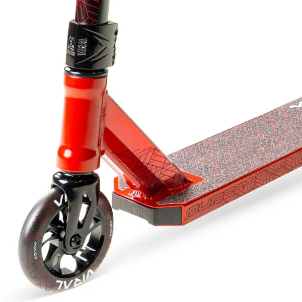 Designed with a compact 4.5” wide alloy deck, 110mm alloy core wheels, and a 24” x 22” low-rise T-bar, the VIRAL PURGE PRO offers balanced geometry for street or park riding. The high-speed ABEC-11 bearings keep you rolling smoothly while the integrated headset and IHC steel fork deliver the responsiveness needed for grinds, whips, and manuals.